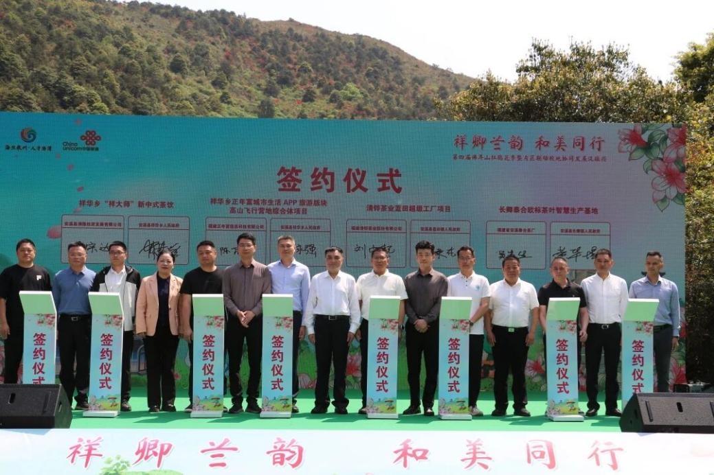 祥华乡正年富城市生活APP旅游版块高山飞行营地综合体项目、“祥大师”新中式茶饮城乡结合产业链终端项目、清铧茶业蓝田超级工厂项目、长卿泰合欧标茶叶智慧生产基地项目集中签约。多位领导共同见证,为区域产业升级注入新动能。