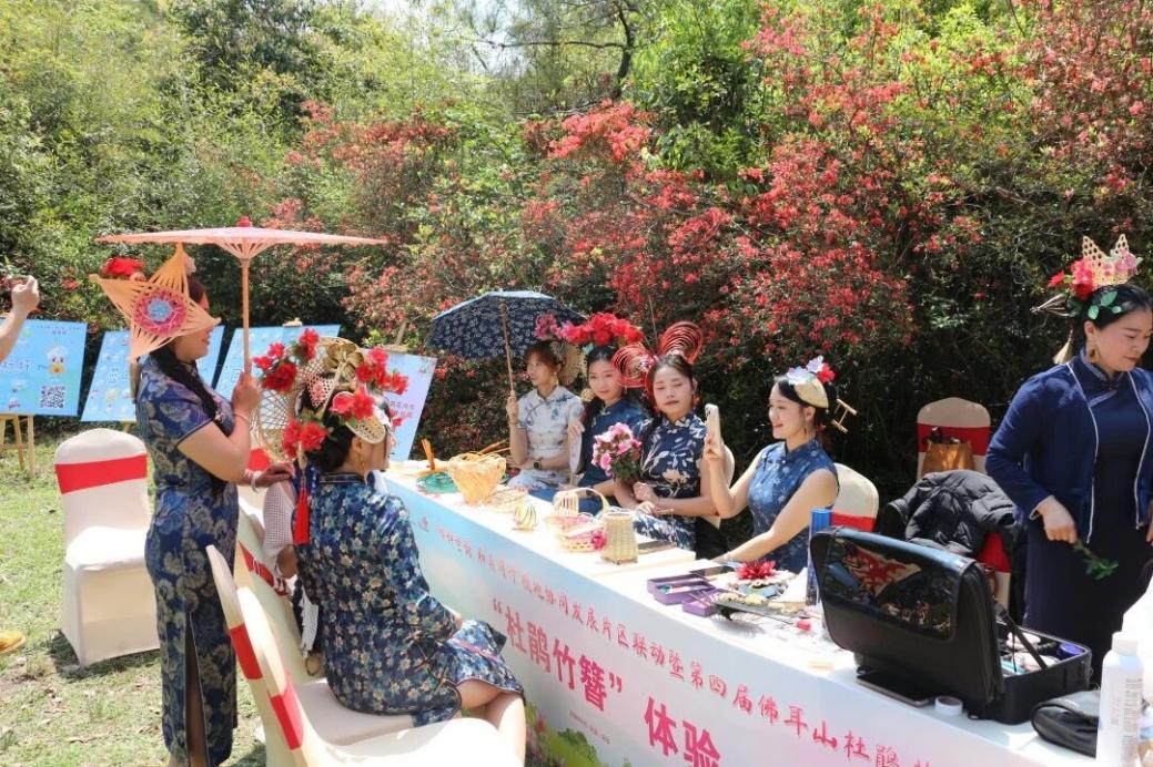 “杜鹃竹簪”体验区里,在“清溪媳妇”的指导下,游客以竹、藤、铁丝为骨架,搭配新鲜杜鹃花,亲手制作独一无二的花簪。完成后戴入花海拍照打卡,笑容与杜鹃相映成趣,定格春日最浪漫的瞬间。