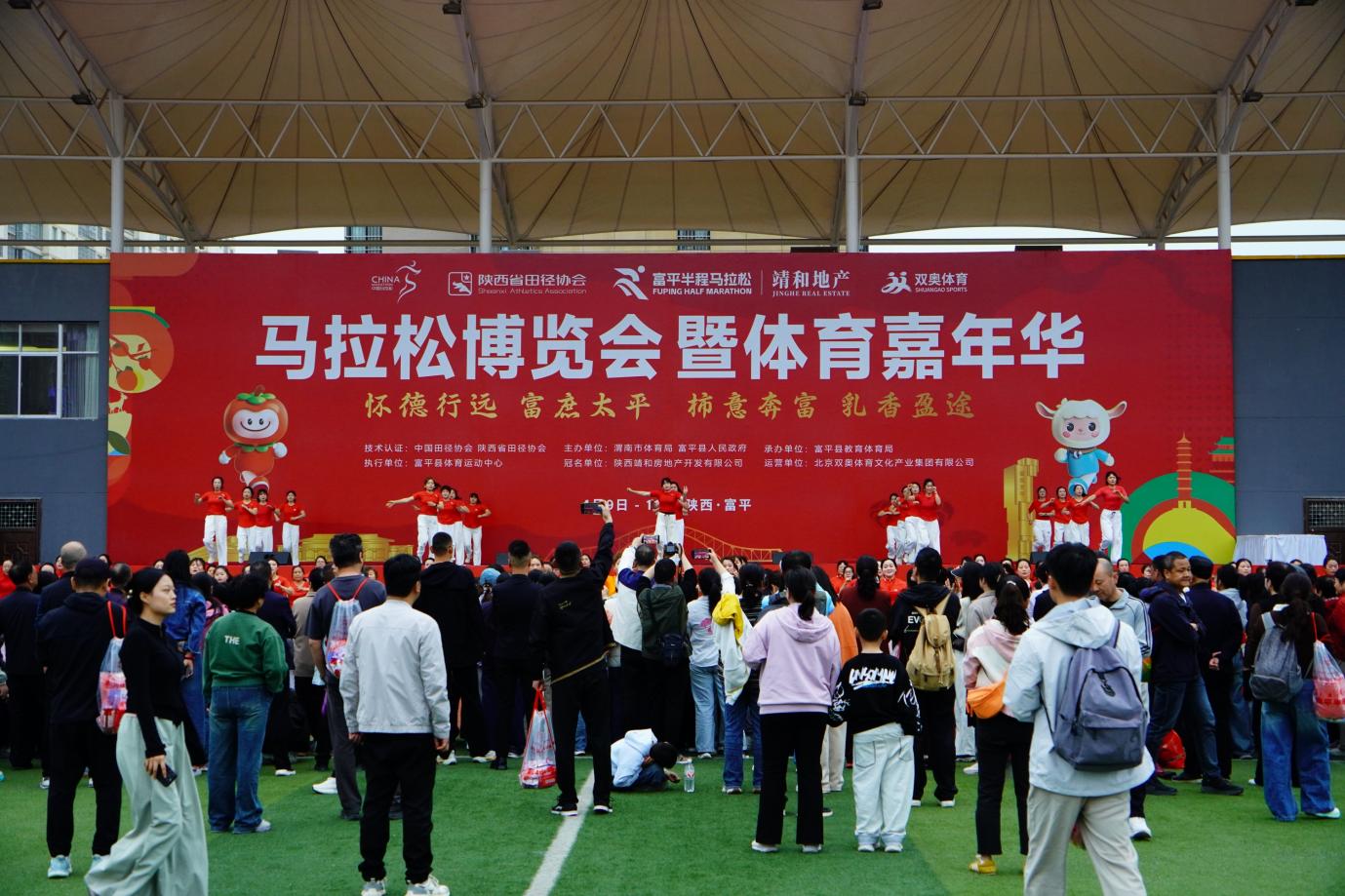赛事启幕前期,富平县配套举办马拉松博览会暨体育嘉年华系列预热活动。为期三天的博览盛会统筹品牌形象展示、参赛装备发放、特色农产展销、非遗文化体验、全民互动健身等多元功能,现场规划布设特色展位100余个,吸引本地骨干企业、知名体育品牌、涉农专业合作社、文旅文博单位等多方主体集中参展观展,累计接待市民群众及参赛跑友入场参观体验约超3万人次。本次博览会坚持“体育搭台、产业唱戏、群众参与、共建共享”核心思路,提前营造浓厚赛事氛围,深度推动体育消费扩容提质、乡村特色好物推广展销、城市文旅资源联动推介,为本次半程马拉松赛事顺利举办筑牢群众基础、做好氛围铺垫。