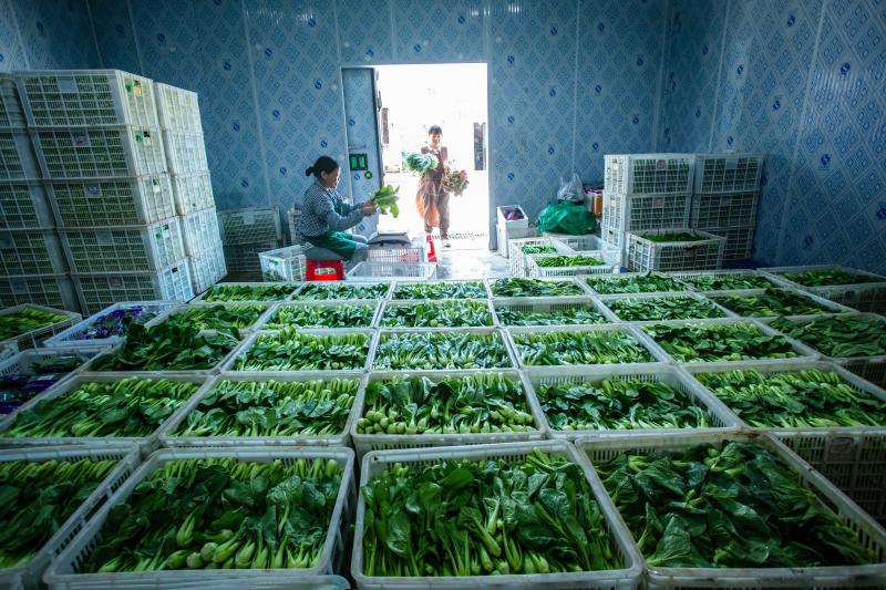 (“雪山呈祥菜”种植基地冷库待配送蔬菜 吴锦明/摄)